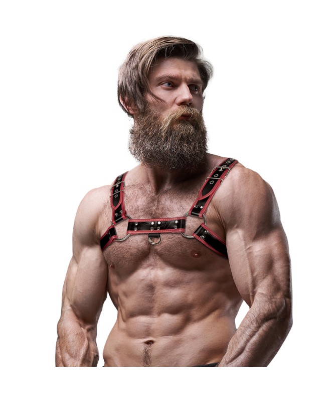 FETISH SUBMISSIVE ATTITUDE - HARNAIS DE POITRINE EN CUIR ÉCOLOGIQUE HOMME NOIR/ROUGEDestinataire :