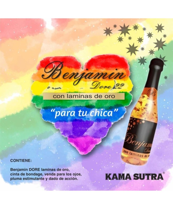 COFFRET avec un CAVA BENJAMIN DORE AVEC PLAQUES D'OR 22 KILATES au caractère fruité, frais et jeune, composé d'un vin mousseux très select AVEC PLAQUES D'OR 22 KILATES POUR VOTRE FILLE AU DRAPEAU ARC-EN-CIEL, LGBT PRIDE.