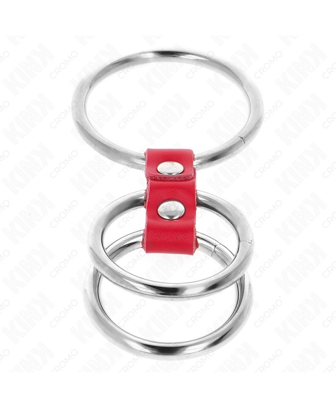 KINK - ANNEAU PÉNIS TRIPLE MÉTAL 3,7 CM À 5 CM CONNECTÉ AVEC DU CUIR ROUGE