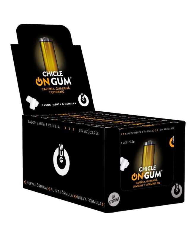 WUG GUM - ON À LA CAFÉINE, AU GINSENG ET À LA GOMME DE GUARANA PRÉSENTOIR 12 X 8 UNITÉS