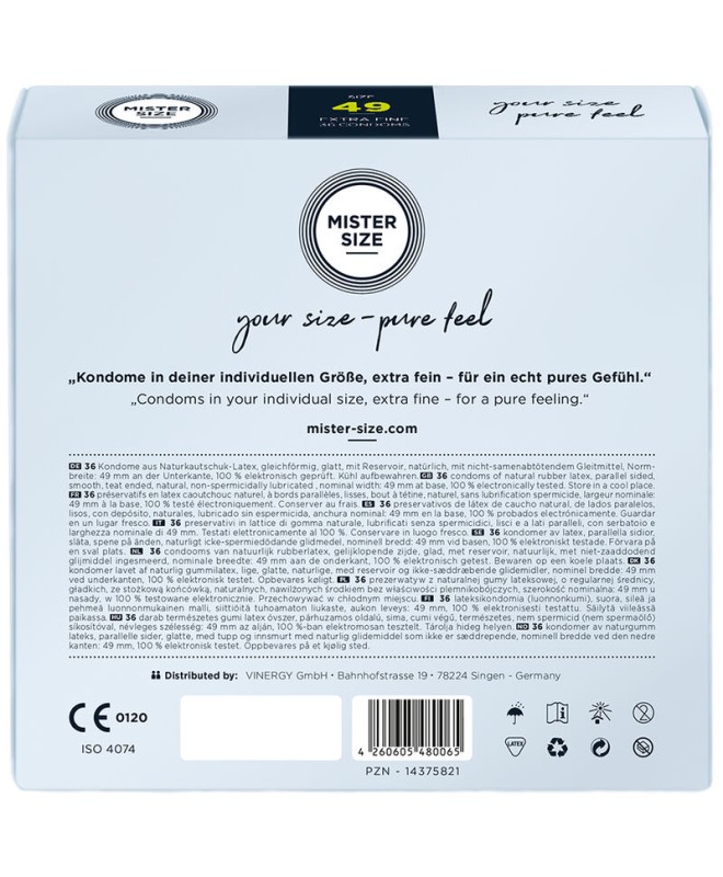 Notre MISTER SIZE 49 est le compagnon idéal de votre pénis sensible et élégant. Ensemble, ils créeront de merveilleux moments de grande extase. Vous n'avez vraiment pas besoin d'une bête puissante pour profiter pleinement du moment ou déplacer des montagnes, juste des sensations justes pour ces caresses intimes qui envoient des frissons de plaisir dans votre corps. MISTER SIZE 49 vous offre une protection sans perdre une seule nuance de sensation.