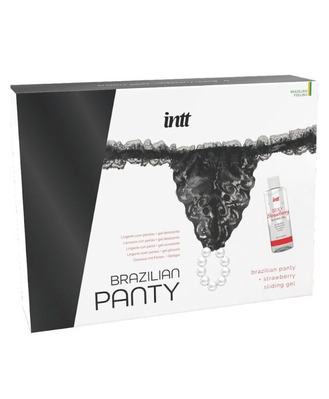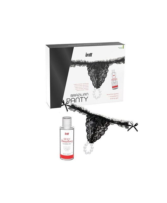 Le Brazilian Panty Black d'INTT est un pack de lingerie sensuelle avec des perles accompagnées d'un gel à base d'eau au goût de fraise.